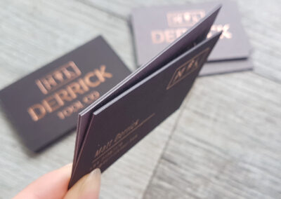 There are so many options with sandwiched business cards! 2 layer duplex, or 3 layer triplex cards, with or without foil, debossing and/or metallic toners. Two layers of same card stock appear as a single, ultra-thick card. You can use three layers in either the same stock, three different coloured stocks, or to create a coloured edge (white/black/white for example).